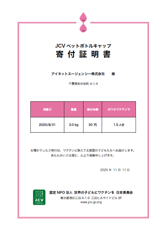 NPO法人「世界の子どもにワクチンを日本委員会」へ、ペットボトルキャップを寄付いたしました。